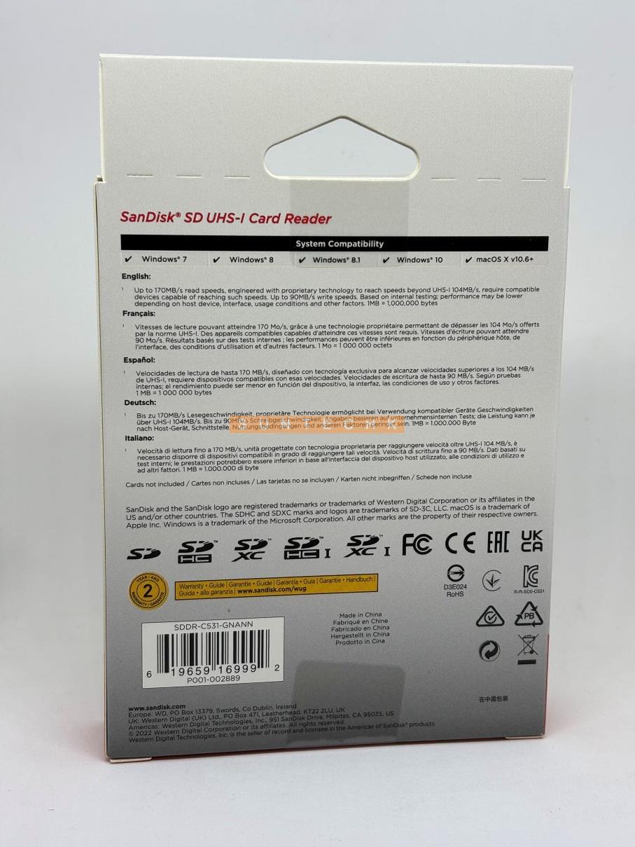 The SanDisk SD™ UHS-I card reader transfers your images fast, delivering image transfer speeds of up to 170MB/s so you can spend your time creating instead of waiting. Using USB 3.0, it moves content up to 10x faster than USB 2.0, and it’s also backward-compatible with USB 2.0 so you can transfer projects to any USB-enabled device. Compact and durable for worry-free portability, the SanDisk SD UHS-I card reader comes with a two-year limited warranty.